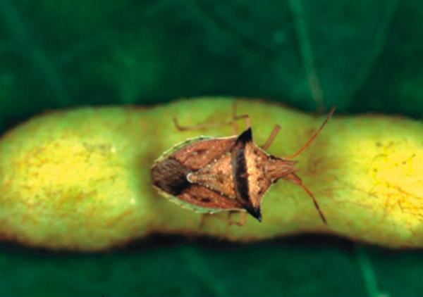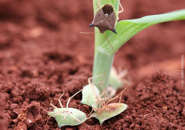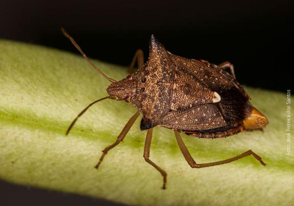 A cor do percevejo é semelhante à palha, dificultando a visualização na lavoura;