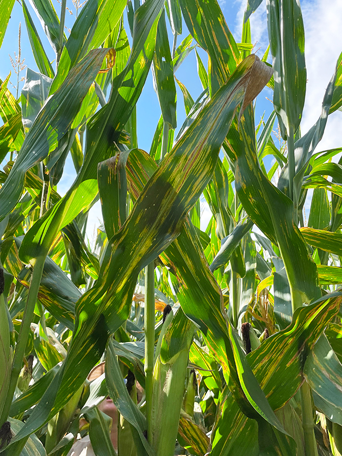 A estria bacteriana do milho é causada pela bactéria Xanthomonas vasicola pv vasculorum, com danos iniciais nas folhas. Em situações de maior severidade da doença, pode ocorrer o comprometimento de até 60% da área foliar, exaustão do colmo, tombamento e apodrecimento dos grãos. O plantio de híbridos tolerantes, o monitoramento e manejo preventivo são essenciais para evitar o agravamento da infecção e a proliferação do patógeno.