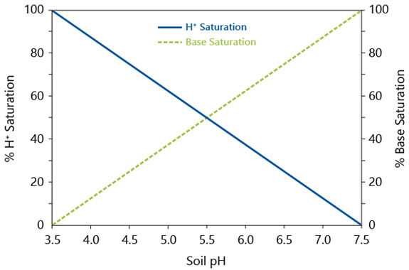 Further knowledge of base saturation is critical to the BCSR method. Base saturation is the sum of base cations (Ca2+, Mg2+, K+, and Na+) held onto the soil exchange sites divided by the total CEC and expressed as a percentage. Base saturation can be described by Figure 2. For this reason, the amount of cations on the exchange sites will be limited as the soil pH decreases or becomes more acidic due to the increased amount of H+ ions on exchange sites and in soil solution.