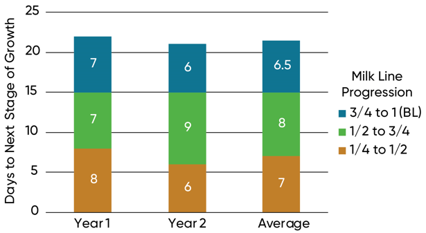 On average, it took seven days to get from ¼ milk line to ½ milk line, six days from ½ milk line to ¾ milk line and seven days from ¾ milk line to black layer (Figure 2).