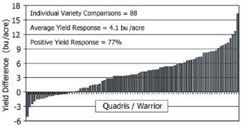 Figure 6. Soybean yield response to Quadris® + Warrior® in Pioneer small-plot research trials.