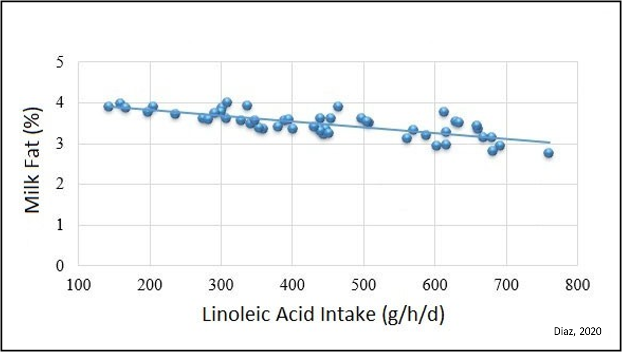 Corn silage is the primary forage choice for dairy farmers due to its high tonnage, nutritional qualities, and cost‐effectiveness. However, even though it is low in fat content, it contains a significant amount of linoleic acid. When included in large amounts, corn silage can add to the ruminal PUFA load, which has been linked to decreased milk fat percentage [2].