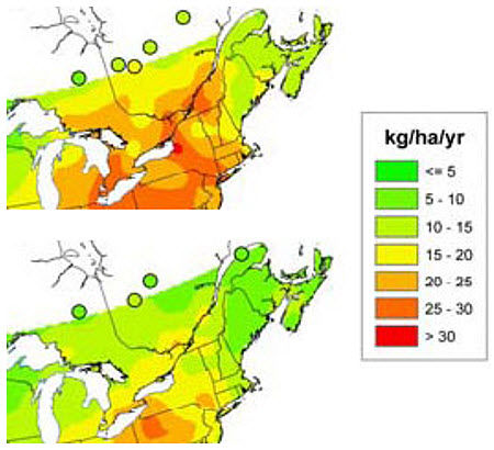 Figure 2. Average annual sulfate deposition from precipitation in eastern Canada, 1990-1994 (top) compared to 2000-2004 (above). (Source: 2006-2007 Progress Report on The Canada-Wide Acid Rain Strategy for Post-2000.)